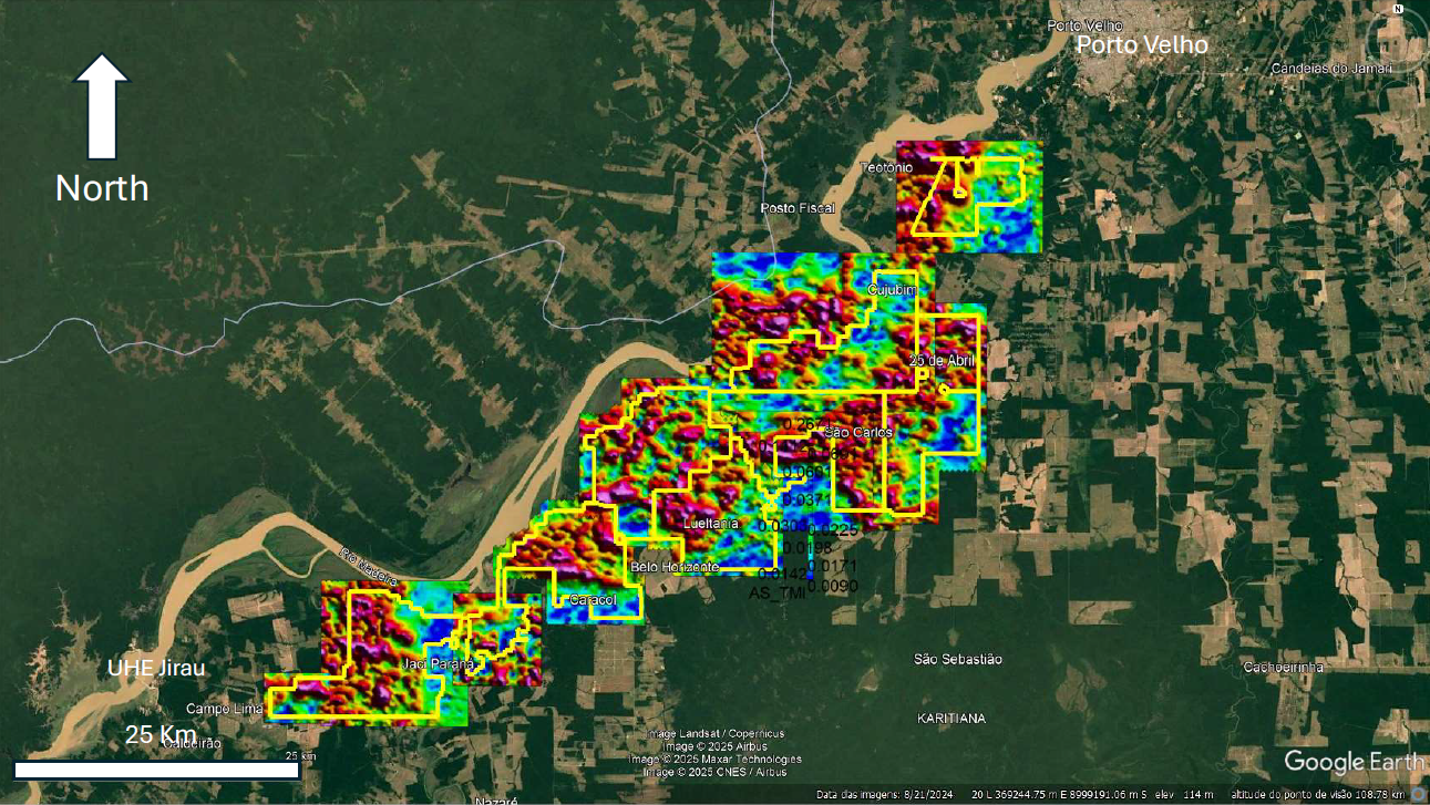 The Company continues to advance exploration efforts, focusing on reconnaissance, wide-spaced drill testing of initial targets beneath shallow sedimentary cover (<20m thick) across its extensive tenement area. Simultaneously, the Company has conducted a comprehensive review of known gold occurrences and active extraction sites influenced by the ancient and modern Madeira River system and its tributaries.