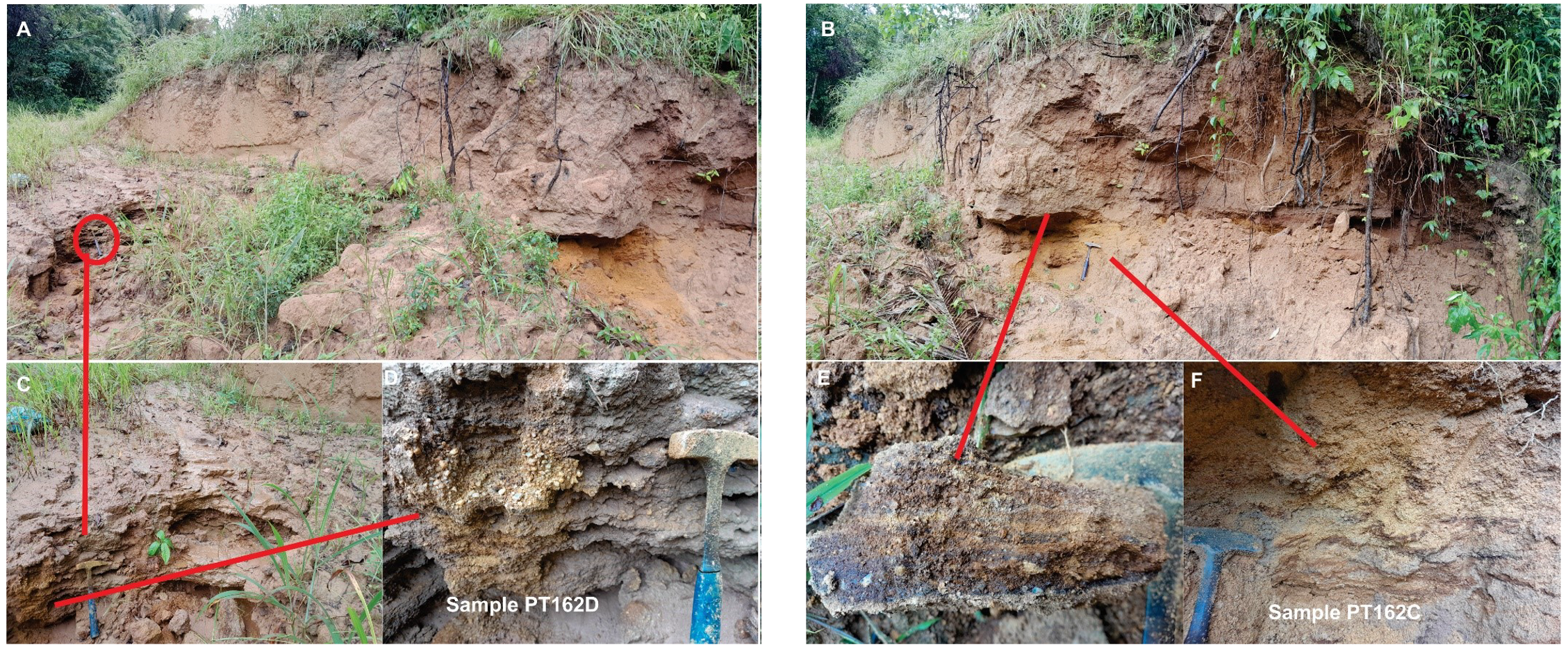 Figure 2. Rare “Mocururu” horizon outcrop from within a Canary Tenement. Two types of “Mocururu” are described from this outcrop, one (left image) with a ferruginous matrix within a compact, non-magnetic sediment comprising angular quartz clasts within a matrix fine to coarse sand. The second type (right image) comprises a more friable “Mocururu” with angular quartz clasts within a sandy, non-ferruginous matrix of fine to coarse sand.